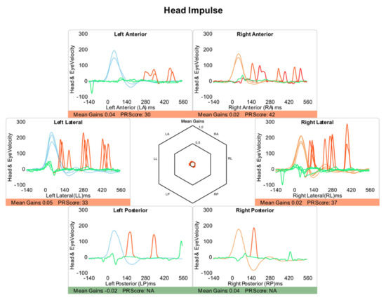 Video-Head Impulse Test. This was performed using a vHIT system that allows the testing of all six semicircular canals (GN Otometrics, Denmark). For this test, the patient wears a pair of lightweight, tightly fitting goggles on which are mounted a small video camera and a mirror that reflects the image of the patient’s right eye into the camera. The eye is illuminated by a low-level infra-red light-emitting diode. A small sensor on the goggles measures the head movement. Calibration is performed and the procedure of vestibulo-ocular testing is initiated. Horizontal semicircular canals (right, RC, and, left, LC) are tested first: the clinician asks the patient to keep staring at an earth-fixed target 1 m. in front and gives the patient brief, abrupt, head rotations through a small angle (about 10–20 degrees), unpredictably turning to the left or right on each trial. At the end of each head turn, the head-velocity stimulus and eye-velocity response are displayed simultaneously on the screen. In a full test, at least 10 impulses are delivered randomly in each direction. The first pair of vertical canals is then evaluated: the patient’s head is rotated 30° to the right while staring at the same earth-fixed target as before, but now out of the corner of his/her eye. Brief, abrupt, forward, and backward head impulses are then carried out, which allow stimulation of the left superior semicircular canal (LA) and the right posterior semicircular canal (RP) respectively. After a full test of at least 10 impulses in each direction, the second pair of vertical canals is evaluated: for this, the patient’s head is rotated 30° to the left while staring at the earth-fixed target. Now, forward head impulses stimulate the right superior semicircular canal (RA) and backward impulses stimulate the left posterior semicircular canal (LP). A full test of at least 10 impulses in each direction is performed. At the end of each full test, all the head velocity stimuli and eye velocity responses are displayed on the computer screen, together with a graph of the calculated VOR gain (ratio of eye velocity to head velocity) for every head rotation (Figure 2). The gain was evaluated as normal or abnormal according to norms by age [21,22]. The second parameter is re-fixation saccades (RS) classified as covert and overt, the first being re-fixation saccades that take place during the cephalic impulse and the second taking place when the impulse has ended. A test was considered normal when the gain of the VOR was according to expected results consistent with age and there were no refixation saccades in any of the six canals evaluated. A test was abnormal when at least in the plane of 1 canal the response is lower in gain than expected and there are re-fixation saccades (Figure 3). In this study, in all the patients with BVL, the response was abnormal for the stimulation of the horizontal right and left superior, horizontal, and posterior semicircular canals as shown in the patient in Figure 4, and the gain in the horizontals was below 0.6.