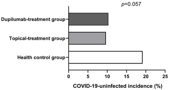 Comparison of COVID-19-uninfected incidence among all groups. COVID-19-uninfected incidences were 19.19%, 9.68% and 10.31% in Health control group (white columnar), Topical-treatment group (grey columnar) and Dupilumab -treatment group (black group) respectively.