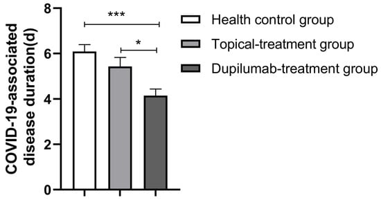 Comparison of COVID-19-associated disease duration in the healthy control group, topical treatment group and dupilumab treatment group (mean ± SEM, * p < 0.05, *** p < 0.001).