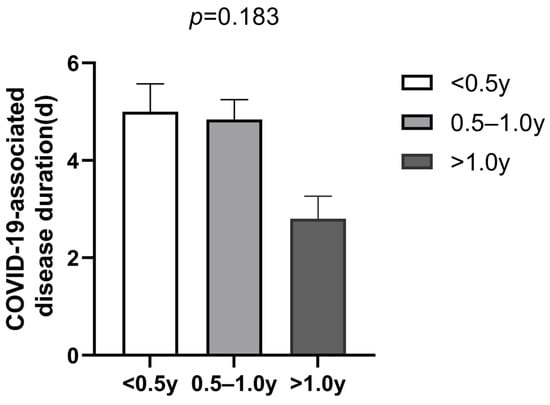 Comparison of COVID-19-associated disease duration in dupilumab treatment group for the <0.5 year, 0.5–1.0 year and >1.0 year subgroups (mean ± SEM, p value generated from comparison of all three groups was 0.183 with Kruskal–Wallis H test).