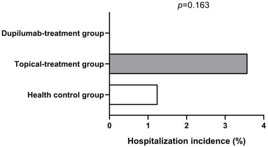 Comparison of hospitalization incidence in the healthy control group (1.25%, white columnar), topical treatment group (3.58%, grey columnar), and dupilumab treatment group (0%, the p-value generated from the comparison of all three groups was 0.163 with Pearson’s χ2 test and Fisher’s exact test).