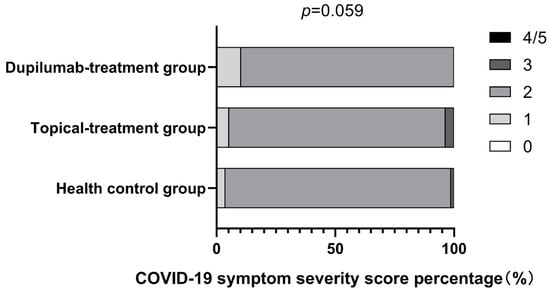 Furthermore, the severity of COVID-19-related symptoms was compared and is shown in Figure 5. There were no individuals with COVID-19 symptom severity scores of “0” and “4–5” in all groups among the patients infected with COVID-19. It is noticeable that the proportion of patients with a symptom score of “2” was the highest among all three groups, and this was followed by the proportion of patients with a symptom score of “1”. The proportion of patients with a symptom score of “3” was rather low (dupilumab treatment group, 0% vs. topical treatment group, 3.57% vs. healthy control group, 1.25%). Overall, there was no significant difference in COVID-19-related symptom scores among all groups (p = 0.059).