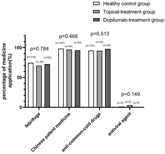 Comparison of the application of medicines for COVID-19 treatment in the healthy control group, topical treatment group and dupilumab treatment group (p-values generated from a comparison of all three groups were 0.784, 0.468, 0.513 and 0.149, respectively, for the use of febrifuge, Chinese patient medicine, anti-common-cold drugs, and an antiviral agent, determined with Pearson’s χ2 test and Fisher’s exact test; n represents the number of individuals in each group using the corresponding medicine).