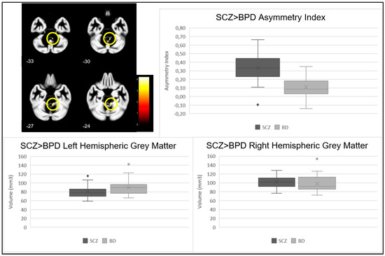 The contrast of higher GM asymmetry index in SCZ compared with BPD, performed at the whole brain level, revealed a significant group difference (p < 0.001) in one cluster with a cluster size of 82 voxels, at the MNI coordinates (11, −34, −26) and (6, −45, −30), corresponding to right cerebellar hemisphere, anterior lobe, gyrus culmen. The analysis of the cluster-specific mean AI revealed a stronger rightward asymmetry in the SCZ group than in the BPD group. The analysis between SCZ and BPD groups of this cluster’s specific GM volume showed that, although not statistically significant (p = 0.080), there is a trend for the SCZ group to have lower GM volume in the left hemisphere. No statistically significant differences were found in the right hemisphere (p = 0.406). These results are described in Figure 1, Table 2 and Table 3.