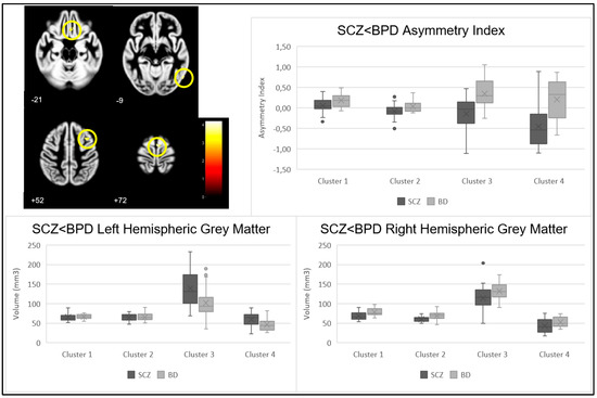 Regarding the hypothesis of higher GM volume asymmetry in BPD compared to SCZ (contrast SCZ < BPD), several clusters were found to have significant differences. On the one hand, differences were found in two clusters corresponding to BA6 in the medial frontal gyrus of the right hemisphere.