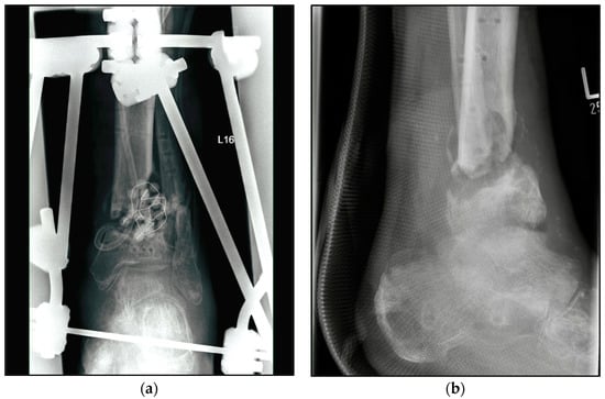- Cibura, C.; Lotzien, S.; Yilmaz, E.; Baecker, H.; Schildhauer, T.A.; Gessmann, J. Simultaneous septic arthrodesis of the tibiotalar and subtalar joints with the Ilizarov external fixator-an analysis of 13 patients. Eur. J. Orthop. Surg. Traumatol. 2022, 32, 1063–1070. [Google Scholar] [CrossRef]
