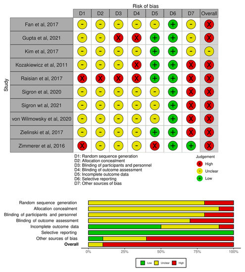 We performed a systematic risk of bias assessment to identify bias for each included trial. Nine studies [28,29,31,32,33,34,35,36,37] had a high risk of bias, and one study [30] had an unclear risk. The risk of bias in individual studies and across the included studies is summarized in Figure 2.