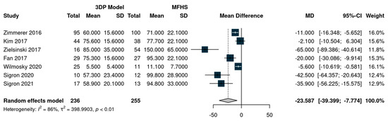 The analysis was carried out using the mean difference as the outcome measure. A random-effects model was fitted to the data. Tests and confidence intervals were computed using the Knapp and Hartung method. A total of seven studies were included in the analysis. The estimated average mean difference based on the random-effects model was 23.58 min (95% CI: −43.98 to −3.19), which was statistically significant (t (6) = −2.82, p = 0.03). According to the Q-test, the outcome is heterogeneous (Q (6) = 44.35, p < 0.0001, tau² = 398.93, I2 = 95%). The forest plot is presented in Figure 3.