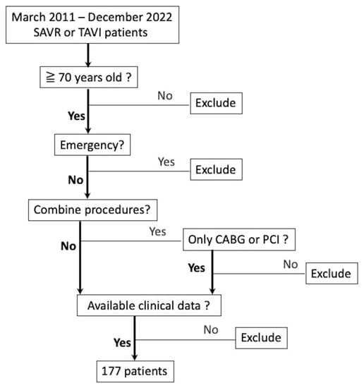 The present study employed specific inclusion and exclusion criteria to recruit eligible participants. Inclusion criteria required the identification of patients aged 70 years or older who received transcatheter aortic valve implantation (TAVI) or surgical aortic valve replacement (SAVR) at our hospital. Among these patients, those who underwent coronary artery bypass grafting (CABG) or percutaneous coronary intervention (PCI) in the same admission were deemed eligible for study enrollment. Conversely, patients who underwent concomitant valve surgery, thoracic aortic surgery, or emergency surgery were excluded from the study, as per the predefined exclusion criteria (Figure 1).