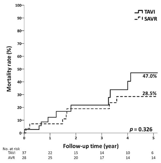 Five-year mortality curves of TAVI and SAVR patients in high-risk group.