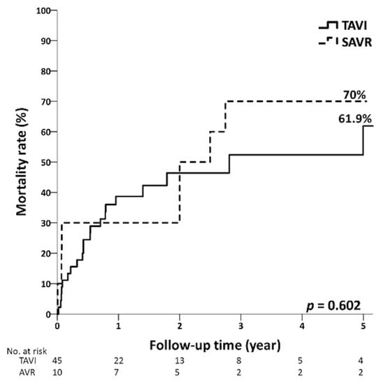 Five-year mortality curves of TAVI and SAVR patients in intermediate-risk group.