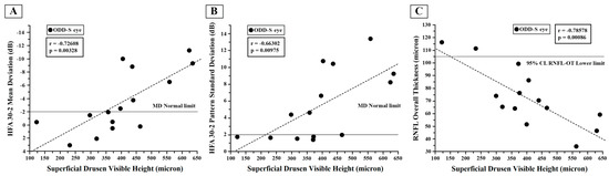 Individual values of superficial optic disc drusen (ODD-S) visible height plotted as a function of the corresponding values of Humphrey 30-2 automated visual field test (HFA) mean deviation (A), of pattern standard deviation (B) and of retinal nerve fiber layer (RNFL) Overall Thickness (C). The solid line indicates the normal limit in (A,B) and the 95% lower normal limit in (C). The dashed line indicates the regression analysis and correlations for which Pearson’s test was used.