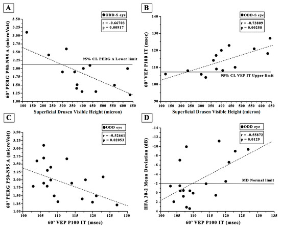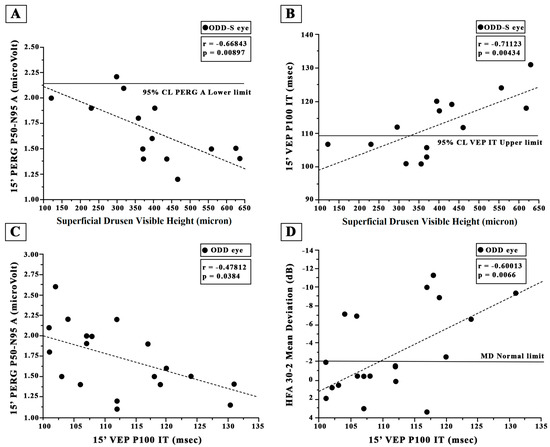 Individual values of superficial optic disc drusen (ODD-S) visible height plotted as a function of (A) the corresponding values of 60′ Pattern Electroretinogram (PERG) P50-N95 amplitude (A,B) and of 60′ Visual Evoked Potential (VEP) P100 implicit time (IT). The solid line indicates the 95% lower normal limit in (A) and the 95% upper normal limit in (B). Individual values of 60′ Visual Evoked Potential (VEP) P100 implicit time (IT) detected in all eyes with optic disc drusen (ODD) plotted as a function of the corresponding values of 60′ PERG P50-N95 A (C) and Humphrey 30-2 automated visual field test (HFA) mean deviation (D). The dashed line indicates the regression analysis and the correlations obtained with Pearson’s test. 60′ refers to the visual stimuli checks subtending 60 min of visual arc.