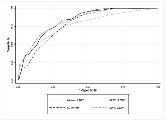 The multivariate model, which adjusted for anamnestic severity (CCI), urgency (NEWS), and prognostic severity (SOFA), revealed that serum albumin concentration was an independent predictor of mortality risk with an OR of 3.767 (95% CI 2.192–6.437) for each one-unit decrease. The discriminatory ability of albumin presented an AUROC of 0.821 (95% CI 0.782–0.860) (Figure 2). The AUROC of albumin (ROC: 0.821; 95% CI: 0.782–0.860), NEWS (ROC: 0.768; 95% CI: 0.711–0.826), CCI (ROC: 0.794; 95% CI: 0.754–0.833), and SOFA (ROC: 0.837; 95% CI: 0.798–0.876) showed that albumin alone performs as good as or even better than the other multi-parametric scores for predicting 30-day mortality in patients with infection in the ED (Figure 2).