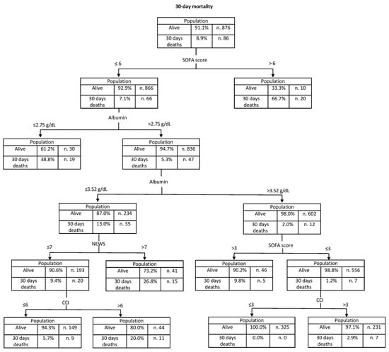 The analysis of the decision tree, shown in Figure 3, confirmed the important role of albumin in the prognostic assessment of infected patients. Indeed, for patients with SOFA scores below 7, serum albumin levels above 2.75 g/dL and 3.52 g/dL indicate a progressive reduction in the risk of death within 30 days (5.2% and 2%, respectively). The decision tree showed a 98.9% ability to classify patients who survived to 30 days, and a 22.3% ability to classify patients who died within 30 days.