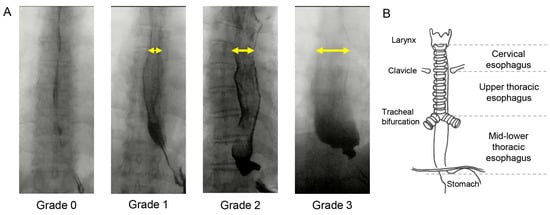 Esophageal motility was evaluated by videofluoroscopic esophagram (VFE). Two independent investigators quantified the degree of esophageal dilatation as an esophageal-dilation (ED) score. In general, the esophagus dilates when a food bolus passes through it and contracts after swallowing, but in some patients with SSc, the esophagus may remain dilated even after finishing swallowing. The esophageal diameter after swallowing was compared to the esophageal diameter during swallowing. The comparative value was calculated by dividing the diameter of the esophagus after esophageal contraction by the maximally dilated esophageal diameter, and an ED grade of 0 was defined as a value of 20% or less, grade 1 as 20–50% value, grade 2 as 50–80% value, and grade 3 as value of 80% or more (Figure 1A). The esophagus, as visualized fluoroscopically, was anatomically divided into three sections based on a revised classification of previous reports [19,20]: (1) cervical esophagus: proximal to the clavicles, (2) upper thoracic esophagus: from the clavicles distal to the tracheal bifurcation, and (3) mid-lower thoracic esophagus: from the tracheal bifurcation to the lower esophageal sphincter. ED grade was evaluated at these locations, and the ED score was defined as the sum of the ED grades at the three sites (Figure 1B). Herein, an ED score ≥ 3 was defined as having apparent esophageal dysmotility, since even healthy elderly patients without esophageal symptoms have mild esophageal dysmotility (ED score 1–2) [20]. The PAS and ED scores were evaluated based on a consensus between two otolaryngologists with at least 10 years of experience. In case of disagreement between the two evaluators, the rating was determined from the recordings and mutual discussions.
