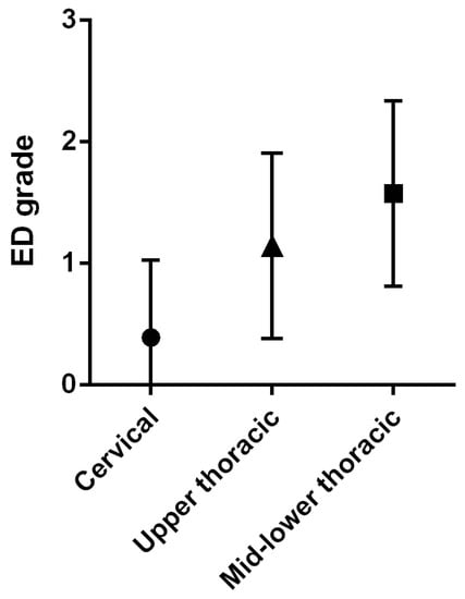 Table 1 lists the demographic data of the enrolled patients. We identified 50 eligible patients. The median age at the time of VFSS was 61 years (interquartile range (IQR), 50–69 years), and there was a female predominance (88%). The median duration of disease at baseline was 110 months (IQR, 33–265 months). Of serum autoantibodies related to SSc, ATAs are detected in 21 patients (42%), ACAs in 11 patients (22%), ARAs in 2 patients (4%), anti-U1 RNP antibodies in 9 patients (18%). Almost all patients presented with Raynaud’s phenomenon and/or puffy fingers. The most common comorbid connective tissue disease was PM/DM in 17 patients (34%), followed by Sjogren’s syndrome in 12 patients (24%). The median FOIS score was 7 (IQR, 6–7), and all subjects took it orally at every meal. Xerostomia was present in 14 patients (28%), and laryngeal sensory deficits in 20 patients (40%). Dysphagia findings assessed by VFSS included reduced pharyngeal contraction in 25 patients (50%) and poor laryngeal elevation and pharyngeal residue in 16 patients (32%). The median ED score was 3 (IQR, 2–4), and the score was highest in the mid-lower thoracic esophagus (Figure 2). Esophageal endoscopy revealed GERD in 21 patients (42%). Four patients (8%) did not have esophageal dilatation on videofluorographic study despite the presence of GERD on endoscopy, while 17 patients (34%) had esophageal dilatation despite the absence of GERD on endoscopy. All except two patients had taken PPIs orally, and approximately 80% of patients had been treated with immunosuppressants.
