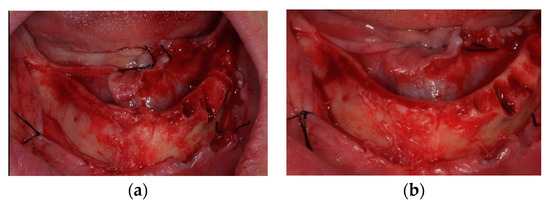 (a) Intraoral pictures of a mandibular case after teeth extraction and flap elevation; (b) a minimal ostectomy was performed in order to compensate for bone discrepancies.