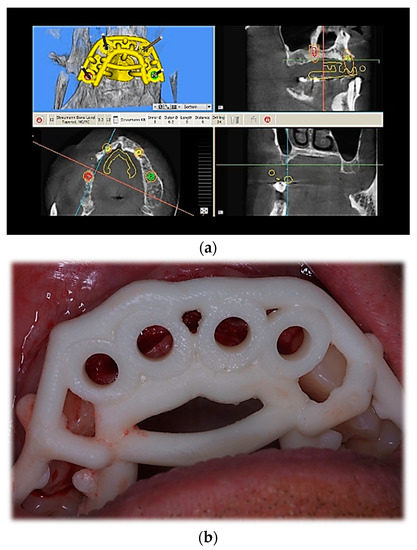 Intraoral picture of a patient of T2 group: (a) surgical stent design before printing; (b) placement of the surgical guide.