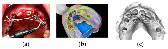 In groups T1 and C, after the impressions were taken, any remaining teeth were extracted, and patients were dismissed and scheduled for the delivery of the temporary bridge within 24 h after surgery from the surgical intervention for all groups, while patients belonging to the T2 group received the immediate temporary prosthesis immediately after surgery, that was obtained directly from the laboratory according to the surgical plan and the preoperative impression. In T2, the prosthesis was delivered together with the surgical guide before surgery. In all the groups, temporary bridges were made of printed acrylic resin and endowed with a titanium milled bar, with no cantilevered extensions (Figure 7).