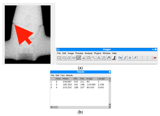 (a,b) X-rays were cropped in order to have only the connection bar/abutment, equalised and magnified. The red arrow indicates the gap between the bar and the abutment, which was measured. They were then imported on ImageJ which allowed us to measure the distance in pixels between one point and another. Measures were then converted to millimetres using the software (https://www.convertire-unita.info/convertire+Pixel+in+mm.php, accessed on 20 April 2023).
