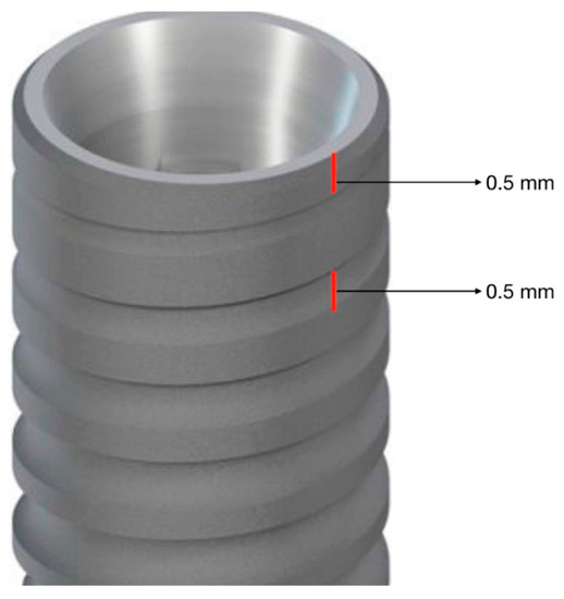 Schematic representation of the implants used in the study with indications of the distance between the platform and the first thread, as well as the distance between the threads.