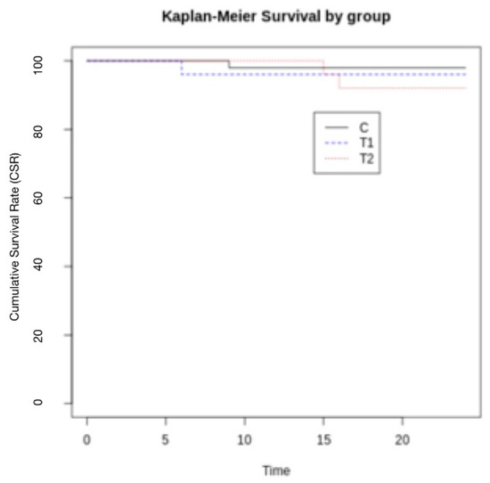 One hundred and fifty patients, whose mean age was 55, were treated from 2018 to 2020, 50 for each group, 75 were males and 75 females. Seven implants failed during the observation period. Two implants failed in T1 before the final prosthetic delivery, 4 implants failed in T2 one year after final loading and 1 implant failed in C 6 months after the final prosthetic delivery. Implant failures were not connected to gender, neither or age. The final CSR was 99.0% for group T1, 98.0% for group T2 and 99.5% for group C. The Kaplan–Meier survival log is reported in Figure 10.