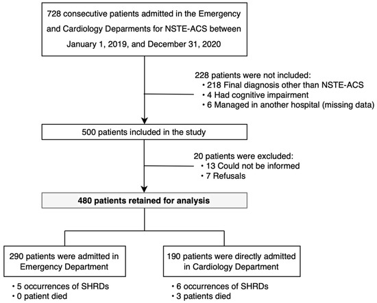 The authors conducted a retrospective study in the emergency and cardiology departments of a university hospital in France. Data were collected between October 2021 and March 2022. The medical records used for the data collection were those of patients admitted to the emergency and cardiology departments for NSTE-ACS between January 2019 and December 2020. This explains the retrospective nature of the study, and such a design was considered appropriate to address the research question. Since patients with NSTE-ACS were identified before the study, this allowed for the study of rare events (in this case, SHRDs due du NSTE-ACS) in a shorter period of time than a prospective cohort study. A total of 500 consecutive patients aged over 18 years were admitted for NSTE-ACS, based on the International Classification of Diseases—Tenth Revision (ICD-10), codings I21.4-(NSTEMI), and I20.0 (unstable angina) to the emergency and cardiology departments of the University Hospital of Strasbourg were included.