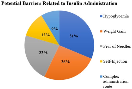 We asked about the opinion of the study participants regarding potential barriers associated with insulin use. The occurrence of hypoglycemia (31%), weight gain (26%), and the fear of needles (22%) were commonly reported barriers during the use of insulin injections (Figure 1).
