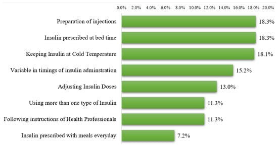 We inquired about the difficulties during insulin use among patients. The most common difficulties reported by the study participants were preparation of injections (18.3%), use of insulin at bed time (18.3%), and storage of insulin at a cold temperature (18.1%) (Figure 2).