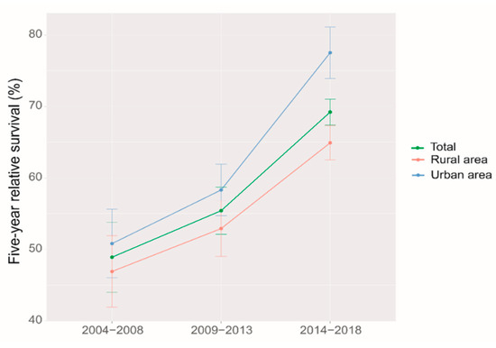 Relative survival (RS) is an important indicator of long-term survival that can reflect cancer prevention effectiveness and prognosis in a specific region. Long-term survivals, such as the five-year and ten-year survivals, which are important indicators to evaluate the prognosis of cancer and reflect the extent of the disease’s harmfulness, have been widely used to monitor the progress of cancer diagnosis and treatment [9,10]. The calculation methods of five-year RS of cancer patients include cohort, complete, and period analysis approach. Traditional cohort approach generally requires the use of five years of follow-up data, which means that a minimum of five years of survival estimates (even an extended period for data compilation, computation, and disclosure) will be delayed, and survival estimates will be significantly lower than real survival. In fact, period method is fundamentally different from traditional cohort method. Period analysis method estimate survival without requiring five years of follow-up data, making it superior to the traditional cohort method in terms of timeliness and accuracy of survival analysis [11,12]. Meanwhile, the period analysis method is widely implemented in Western populations as the “gold standard” for long-term survival assessment for patients with malignant cancers [13,14].