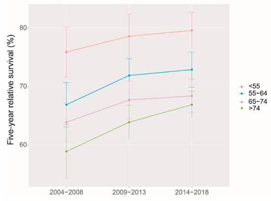 We identified a clear upward trend of five-year RS over the study period, both overall and stratified by region and age at diagnosis during 2004–2018. (Figure 1 and Figure 2). We also found that the trend of increasing five-year RS stratified by age at diagnosis slowed down after the 2009–2013 period, especially in the 65–74 age group, which largely leveled off. The five-year RS gap between the age 65–74 years, and >74 years groups were narrowed down during 2014–2018 compared to those during 2009–2013.