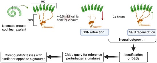 Identification of drug classes that are perturbagens of SGN regeneration. As reported by Wu et al. (top row), neonatal murine cochlear explants were exposed in vitro to 0.5 mM kainic acid for 2 h to cause excitotoxicity and SGN retraction (red arrow) []. Over the next 24 h in culture, SGNs grew back toward and synapsed onto IHCs (green arrow). In this study, DEGs during the neural outgrowth phase were analyzed with CMap and the LINCS unified environment (CLUE) to identify perturbagen classes with similar or opposite signatures to the transcriptome of regenerating SGNs. In the human cochlea, each hair cell receives approximately 10 SGN connections and we have presented a simplified representation. Abbreviations: CMap, Connectivity Map; DEG, differentially expressed gene: IHC, inner hair cell; LINCS, Library of Integrated Network-based Cellular Signatures; SGN, spiral ganglion neurite. Created with BioRender (https://biorender.com; accessed on 22 February 2023).