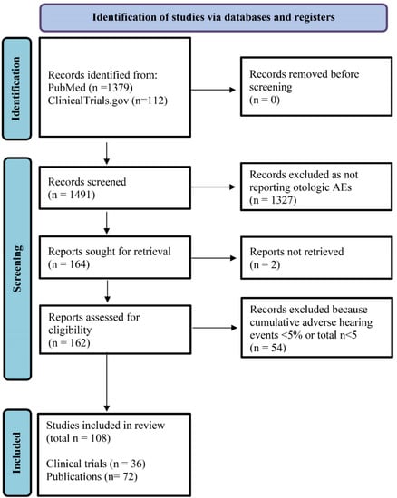 PRISMA flow diagram of the literature review. A literature review of PubMed (for publications) and ClinicalTrials.gov (for registered trials) was conducted to identify the reported rates of otologic adverse events (AEs) associated with drugs targeting insulin-like growth factor 1. Search terms included the drugs’ generic, experimental, and trade names (see Methods Section 2.3). During screening, 36 reports with overlapping results were consolidated.