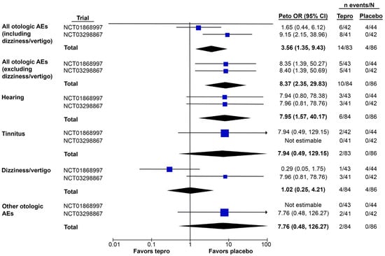 Compared with a placebo, teprotumumab was associated with a higher risk of hearing-related AEs (pooled Peto OR [95% CI]: 7.95 [1.57, 40.17]) and the effect was significant, with a Z-score of 2.51 (p = 0.01) (Figure 3 and Table 3). Teprotumumab was not associated with a higher risk of dizziness/vertigo (pooled Peto OR [95% CI]: 1.02 [0.25, 4.21]; Z-score: 0.03, p = 0.97). No tinnitus events were reported in NCT03298867 and no “other” otologic AEs were reported in NCT01868997. Thus, teprotumumab may be associated with a higher risk of tinnitus (pooled Peto OR [95% CI]: 7.94 [0.49, 129.15]) and other otologic AEs (7.76 [0.48, 126.27]) vs. placebo, although the overall effect was not significant in either case (Z = 1.46 and 1.44, respectively; both p > 0.05). Additionally, the wide CIs indicate a large degree of uncertainty around the OR estimates.