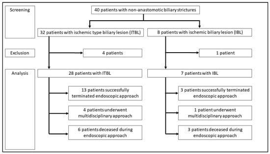 A systematic search of available electronic patient files using the terms “ischemic-type biliary lesion”, “ischemic biliary lesion”, “ITBL”, “IBL”, “non-anastomotic biliary strictures”, and “NAS” was performed to identify patients eligible for inclusion. Patients were screened from 2008 to 2016.