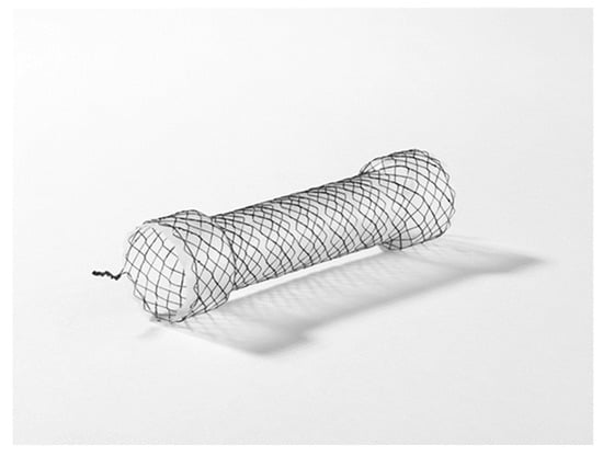 Self-expandable removable stent treatment has a high success rate of up to 80% for leak closure. Endoscopic stenting is considered one of the standard treatments for sleeve leakage [14]. Stenting offers the advantage of simultaneously covering the leak site and releasing the gastric stricture, and we believe that leaks near the esophagogastric junction are the best indications for stenting [19]. In clinical practice, esophageal stents are often used to treat sleeve leakage. In Japan, full-coverage esophageal stents available include HANAROSTENT® (M.I. Tech., Pyeongtaek-si, Republic of Korea; Figure 4) for the over-the-wire method and Niti-S® (Taewoong Medical, Gimpo-si, Republic of Korea) for the through-the-scope method. The length of the stent should be determined based on the location of the sleeve leakage and the distance to the stenosis. Although some reports suggest the effectiveness of long stents [20], it should be noted that stents that are too long may obstruct the outflow tract or cause erosion/ulceration due to contact between the stent tip and the gastric wall.