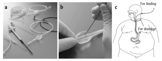 The PTEG kit (SB-KAWASUMI LABORATORIES, INC., Akita, Japan) is commercially available for US$500 and includes ready-to-use devices, such as a needle with a sheath, rupture-free balloon (RFB), dilator, guidewires, and long placement tube (Figure 5a,b). Furthermore, an additional indwelling tube through the same opening as the primary PTEG (double PTEG) simultaneously enables separate enteral nutrition access and gastric drainage (Figure 5c). This technique is described in a previously reported video [22].