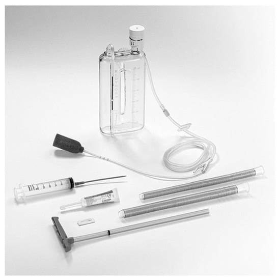 Endo-SPONGE® kit including open-pore sponge drain, two silicon overtubes, the sponge pusher, and the irrigation set (B. Braun, Meslungen, Germany).