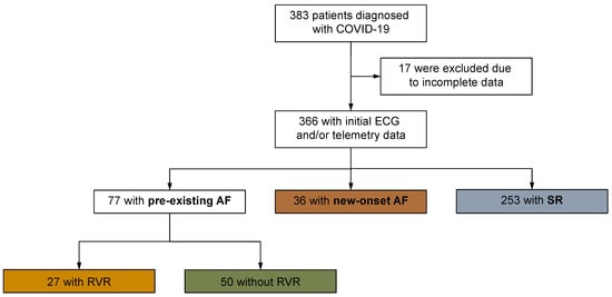 Flow chart of the study population. AF = atrial fibrillation, SR = sinus rhythm, RVR = rapid ventricular rate. This study included 383 patients hospitalized with COVID-19 infection; 17 patients had to be excluded from the statistical analysis due to insufficient data collection. The patient record was analyzed concerning AF, recording the documented electrocardiograms (ECG) and events in telemetric monitoring during the hospital stay. Patients without a history of AF and a documented sinus rhythm (n = 253) were assigned to the control group. Patients with AF (n = 117) were differentiated according to whether they had a history of AF (n = 77) or whether they had new-onset AF during hospitalization (n = 36). The former population was also considered regarding the question of whether a patient with previously known AF suffered RVR (n = 27) or had no such rhythm events during hospitalization (n = 50).