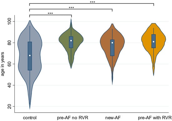 Age distribution of the individual study groups. *** p < 0.001. Patients with new-AF were, on average, 75.5 years old (SD ± 12.0); patients with preexisting AF and no RVR were 80.2 years old (SD ± 8.7); and patients with preexisting AF and RVR were 79.7 years old (SD ± 10.5). All patients in the groups with AF were significantly older than patients in the control group, who were, on average, 66.4 years (SD ± 17.0) old.