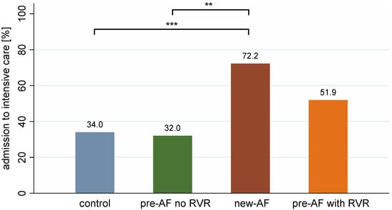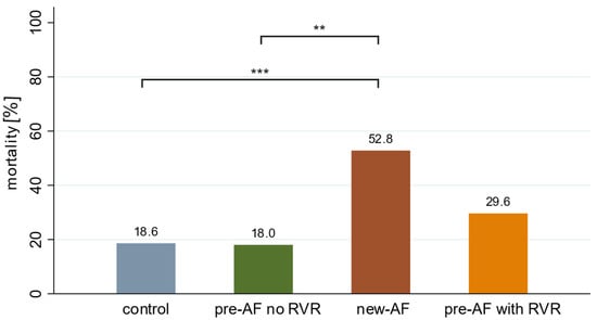 The intrahospital mortality rate of the individual study groups. ** p < 0.01, *** p < 0.001. In patients with new-AF, a mortality rate of 52.8% was found, which was significantly higher than the control (18.6%) and pre-AF no RVR (18%).