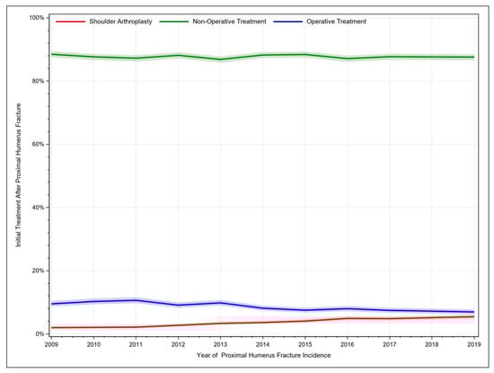 Fracture treatments were categorized into three groups: shoulder arthroplasty, other types of surgeries (ORIF), and non-surgical approaches. To identify these treatments, the study used a set of Common Procedural Terminology (CPT) codes previously established by Bell and co-authors []. Patients who did not receive any of these treatments, but were fitted with a sling or other immobilization, were classified as receiving non-operative treatment. The study examined the frequency of these treatments for proximal humerus fractures during the 10-year study period.
