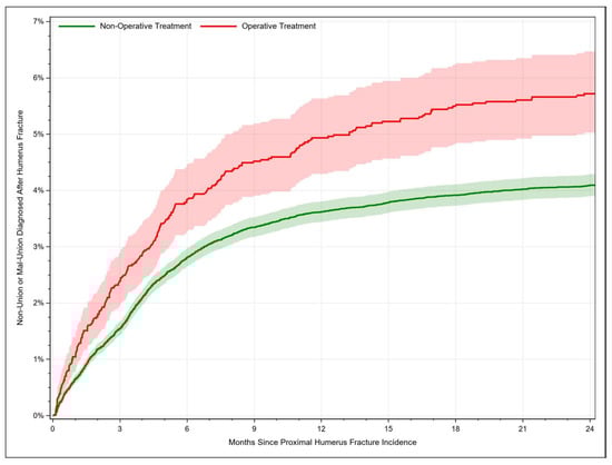 Survival analysis techniques were applied to calculate the outcomes. The Kaplan–Meier (KM) method, with the Fine and Gray sub-distribution adaptation to account for competing risk, was performed to calculate the cumulative incidence rate of the malunion/nonunion, infection, and mechanical complications. Post-fracture infection and mechanical complications were analyzed only for patients who received shoulder arthroplasty or other operational treatments such as fixation devices. To investigate outcomes and compare risk among patients receiving different types of treatment, Cox regression was used while also accounting for competing risk. Possible confounding factors were adjusted for in the Cox models, which included demographic, clinical, and several community-level socioeconomic measures as covariates. Demographic factors such as age, sex, race, resident region, and Medicare buy-in were incorporated, while clinical factors consisted of osteoporosis, obesity, diabetes mellitus, rheumatoid disease, chronic kidney disease, tobacco dependence, regular use of anti-coagulant, regular NSAID use, prior osteoporotic fracture, hypertensive disease, ischemic heart disease, cerebrovascular disease, chronic obstructive pulmonary disease (COPD), and congestive heart failure. These conditions were identified from physician records in the one-year period before the fracture, with Table A1 (Appendix A) providing the codes used to identify them.
