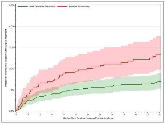 For fractures managed with shoulder arthroplasty, the infection rate rose from 2.02% [95% CI: 1.42–2.77] after 12 months to 2.66% [95% CI: 1.95–3.54] after 24 months. Fracture-related infections occurred in 0.24% [95% CI: 0.13–1.39] of the cases after 1 month, in 1.09% [95% CI: 0.81–1.45] after 12 months and in 1.40% [95% CI: 1.06–1.80] of the cases after 24 months (Figure 3). Thus, the risk of developing an infection after PHF was twice as high after joint replacement compared to osteosyntheses procedures (HR = 2.09, 95% CI: 1.46–2.98, p < 0.001). Further risk factors for an infection comprised age older than 75 years compared to 65–69 years, female sex, and sustaining an open fracture (Table 3).