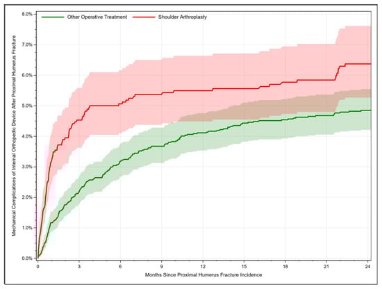 For patients treated with shoulder arthroplasty, mechanical complications occurred in 3.26% [95% CI: 2.50–4.17] of cases after 1 month, whereby the complication rate increased to 6.37% [95% CI: 5.27–7.61] after 24 months. Additionally, mechanical complications after other operative treatment procedures rose from 1.17% [95% CI: 0.87–1.53] after 1 month to 4.85% [95% CI: 4.21–5.55] after 24 months (Figure 4). Hence, the risk was higher when PHFs were managed with joint replacement (HR = 1.66, 95% CI: 1.32–2.09, p < 0.001). Neither age nor any of the considered clinical factors were identified as significant risk factors for mechanical complication. Only female sex resulted in a significant lower hazard ratio (HR= 0.67, 95% CI: 0.52–0.87, p = 0.003).
