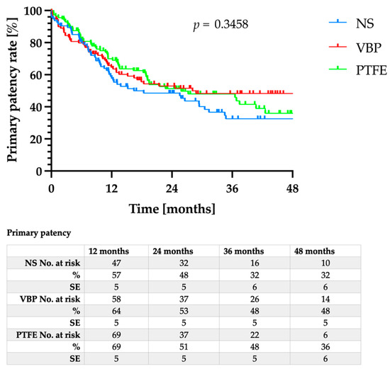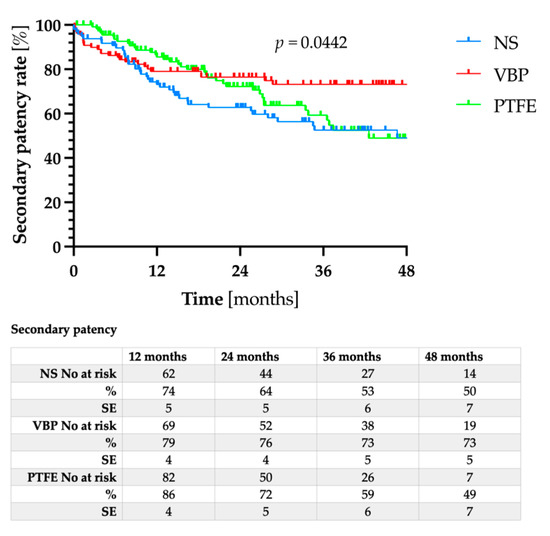 The mean follow-up was 32 ± 16.5 months, with no significant differences between the three groups (p = 0.137). While the primary patency for VBP did not differ significantly from either NS or PTFE (Figure 1, p = 0.346), the primary assisted patency (Figure 2, p = 0.003) as well as the secondary patency (Figure 3, p = 0.044) for VBP were significantly superior compared to NS and PTFE.