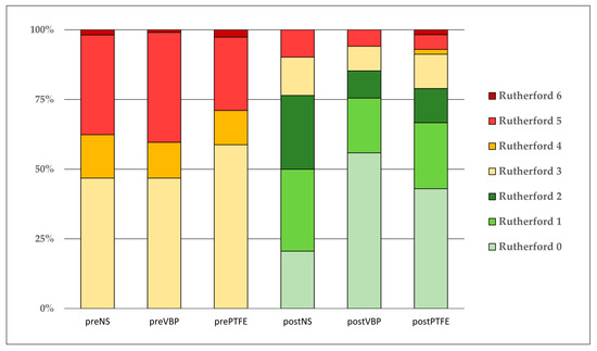 In total, 49% of the study population presented with CLTI prior to revascularization. In the PFTE group, the majority (59%) of patients suffered from severe lifestyle-limiting claudication, whereas in the VBP and NS groups, CLTI was more frequent without statistical significance (Figure 4). The comparison of the baseline values of the Rutherford categories pre revascularization with the values at the latest follow-up showed improvements in all groups after excluding patients with major amputations. After revascularization, clinical improvement was highest in the VBP group compared to the other groups. The mean change in the Rutherford category was significantly better in the VBP group (3 ± 1.6) compared to the PTFE (2 ± 1.8) and NS group (2 ± 1.5) (p = 0.006). In the VBP group, 83% improved at least one Rutherford category after revascularization versus 80% in the PTFE group and 76% in the NS group (p = 0.384). Significantly more patients in the bypass groups (VBP as well as PTFE) presented with Rutherford category 0 or 1 compared to the NS group at the end of follow-up (VBP 71%, PTFE 67% vs. NS 47%; p < 0.001). No change in the Rutherford category was seen in 16% of the NS group vs. 11% in the VBP and PTFE groups, respectively (p = 0.253). A deterioration of the Rutherford category at last follow-up compared to before revascularization was more frequent in the PTFE group (5%) versus the VBP (1%) and NS group (1%) (p = 0.054). All patients presenting with Rutherford category 6 prior to revascularization achieved wound healing after the revascularization. Both patients in the PTFE group with Rutherford category 6 at the time of last follow-up deteriorated from categories 5 and 4 pre-revascularization. CLTI patients treated with VBP surgery improved significantly better compared to the PTFE and NS groups (VBP: 4 ± 1.5, PTFE: 3 ± 2.2, NS: 3 ± 1.6 Rutherford categories; p = 0.004). The limb salvage rates after 4 years were almost identical (VBP: 92%, PTFE: 92%, NS: 90%; p = 0.934). In total, major amputation was necessary in 18 (5%) of the patients, with no significant difference between the three groups (NS 6% vs. VBP 6% vs. PTFE 4%, p = 0.797). There was no perioperative mortality, and survival after 4 years was comparable (VBP: 89%, PTFE: 82%, NS: 81%; p = 0.634).