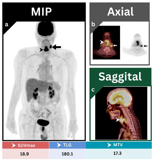 (a) MIP; (b) axial PET/CT, and axial PET; (c) sagittal PET/CT images showing an intensely hypermetabolic malignant glottic-mass lesion (arrowheads) with direct invasion to left para-glottic space and thyroid cartilage. This was associated with a single hypermetabolic left level III cervical lymph node (arrows). The overall staging result was T4aN1M0, which is consistent with the post-operative biopsy.