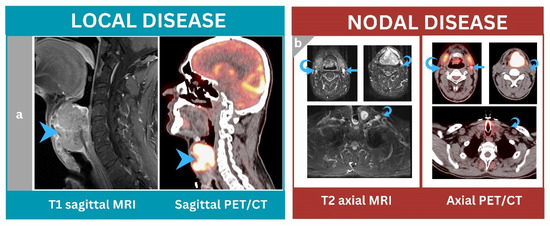 A 49-year-old male patient underwent baseline neck MRI followed by [18F]FDG PET/CT for staging purposes. (a) Sagittal PET/CT and sagittal T1 MRI images showed a large lobulated transglottic-mass lesion with an extra-laryngeal extension that was highly [18F]FDG avid and heterogeneous on MRI (arrowheads). (b) Axial PET/CT and axial T2 MR images showed a prominent left level IIa cervical lymph node that was hypermetabolic and enhanced by MRI (arrows), suggesting metastases. Other right level IIa and left III–IV lymph nodes were heterogeneously enhanced but non-[18F]FDG avid (curved arrows). [18F]FDG PET/CT nodal staging outperformed MRI and matched the biopsy results (N1 nodal disease).